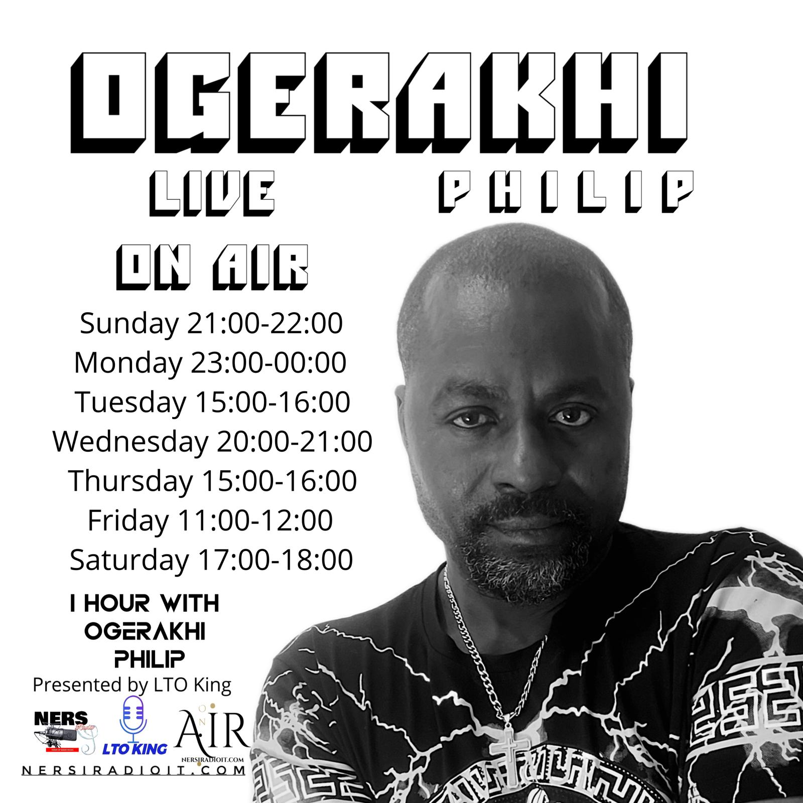 LISTEN TO MY SONGS ON AIR LIVE ON NERSI RADIO EVERY DAY. 1 HOUR WITH PHILIP OGERAKHI LIVE ON AIR Presented by:LTO KING TIME. Sunday 21:00 - 22:00. Monday 23:00 - 00:00. Tuesday 15:00 - 16:00. Wednesday 20:00 - 21:00. Thursday 15:00 - 16:00. Friday 11:00 - 12:00. Saturday 17:00 - 18:00. FOLLW THE LINK FOR MORE DETAILS https://nersiradioit.com/program/483540/1-hour-with-philip-ogerakhi-live-on-air/